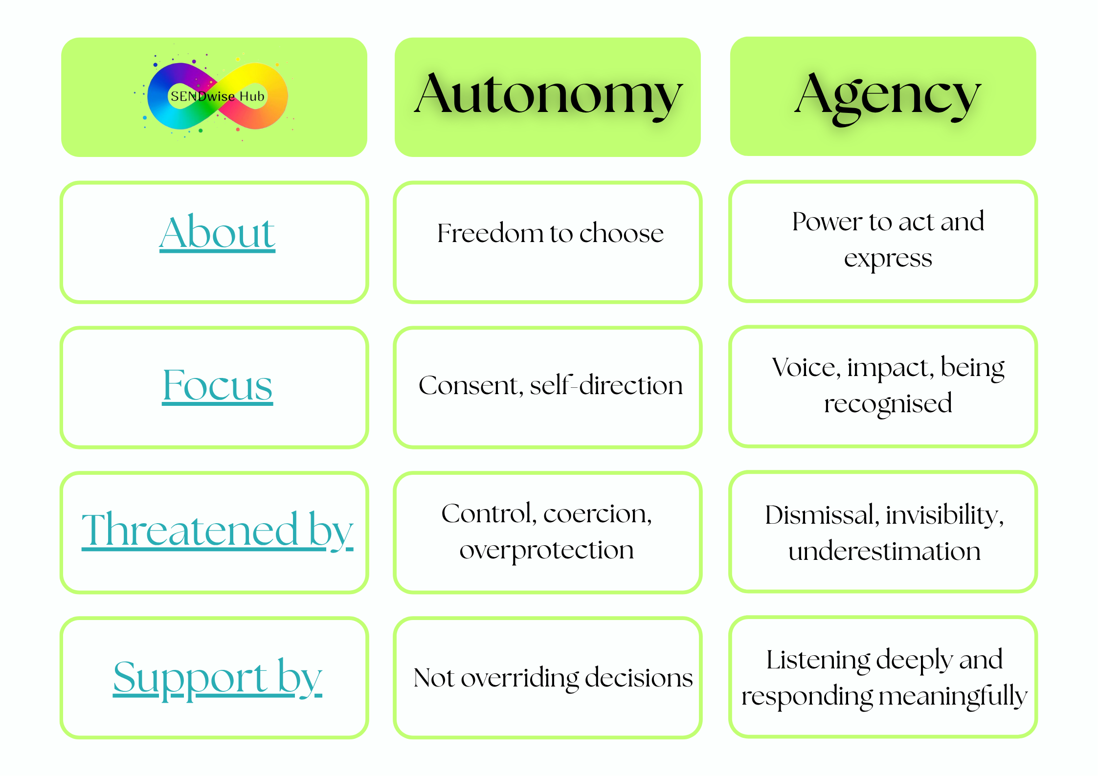 Autonomy and agency are closely related and even though they are sometimes used interchangeably, they carry distinct meanings, especially in neurodivergent context or any conversation about empowerment, consent and support.