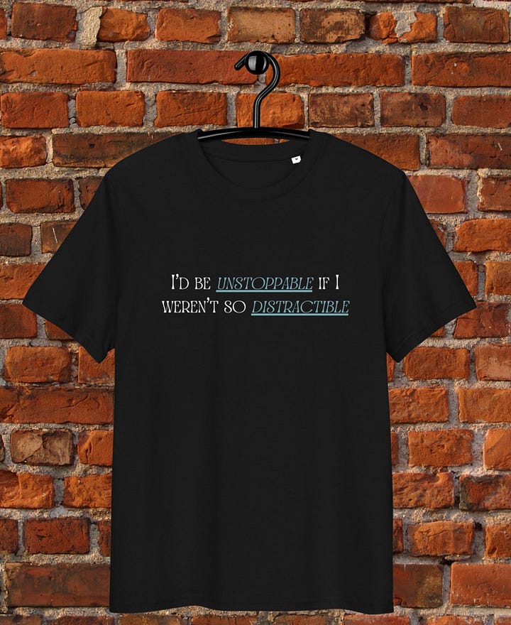 ⭐ “Chasing Dopamine” and “I’d be unstoppable if I weren’t so distractible” are two of the things that describe who I am. With this in mind, I created two t-shirts because sometimes identity needs to be loud, playful and worn with pride. Neurodivergent brains deserve to be celebrated and what better way than with designs that speak our language: dopamine-chasing, distraction-embracing and all.